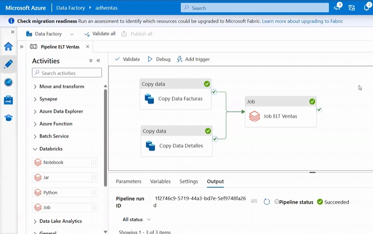Finalmente, se realizó una ejecución completa del pipeline para validar el proceso de principio a fin. Esto incluyó el monitoreo de las actividades, la verificación de los datos transformados en la base de datos y una breve discusión sobre cómo escalar y automatizar estos procesos en proyectos reales. Esta sesión brindó a los participantes una base sólida para iniciarse en el desarrollo de soluciones de integración de datos en Azure.
